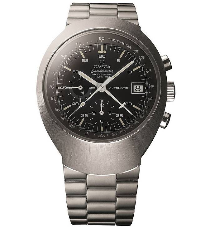 - 1971년 런칭한 스피드마스터 마크(Mark) III. 오메가 최초의 오토매틱 크로노그래프 모델로, 후드형 러그 디자인이 특징적인 일명 '파일럿' 케이스에 새로운 자동 1040 칼리버를 탑재.