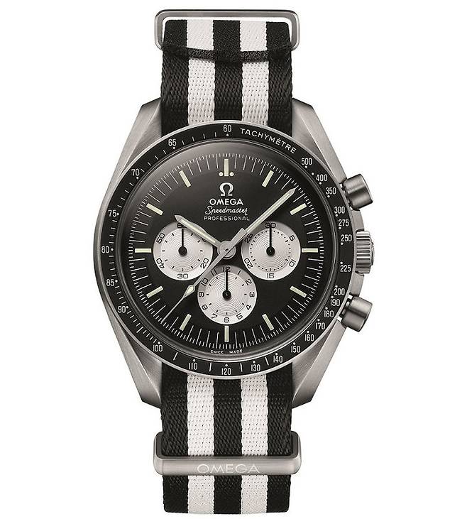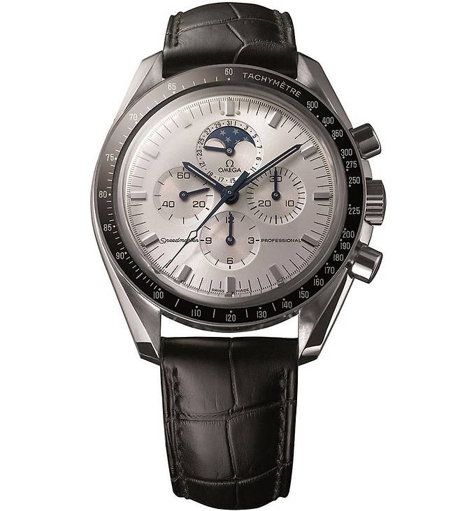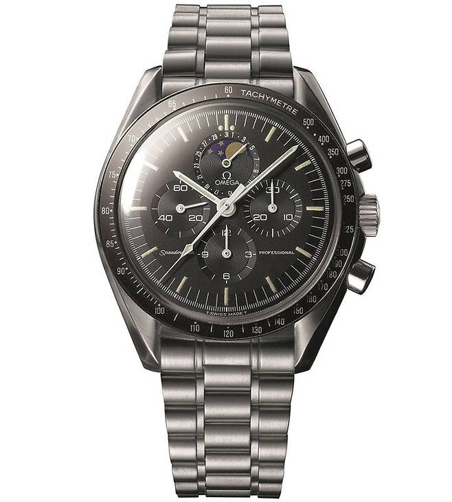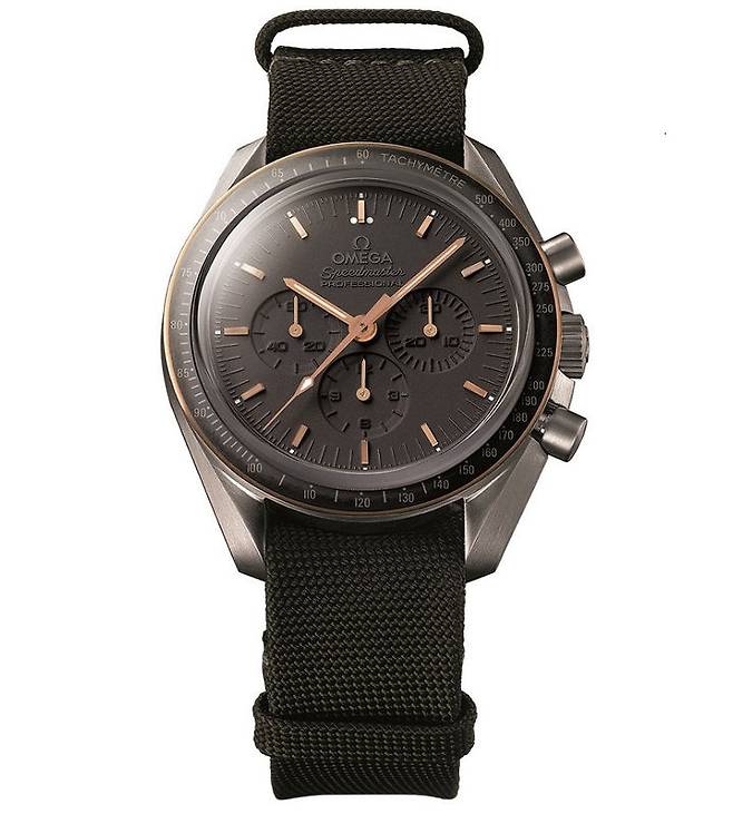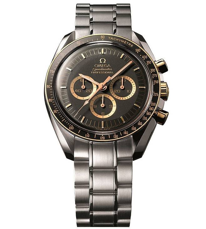 - 2014년 발표한 스피드마스터 아폴로 11 45주년 기념 에디션. 전체 브러시드 가공한 그레이드 2 티타늄 케이스로 제작되었으며, 브라운 컬러 나토(NATO) 스트랩을 매칭해 특색을 드러냄.