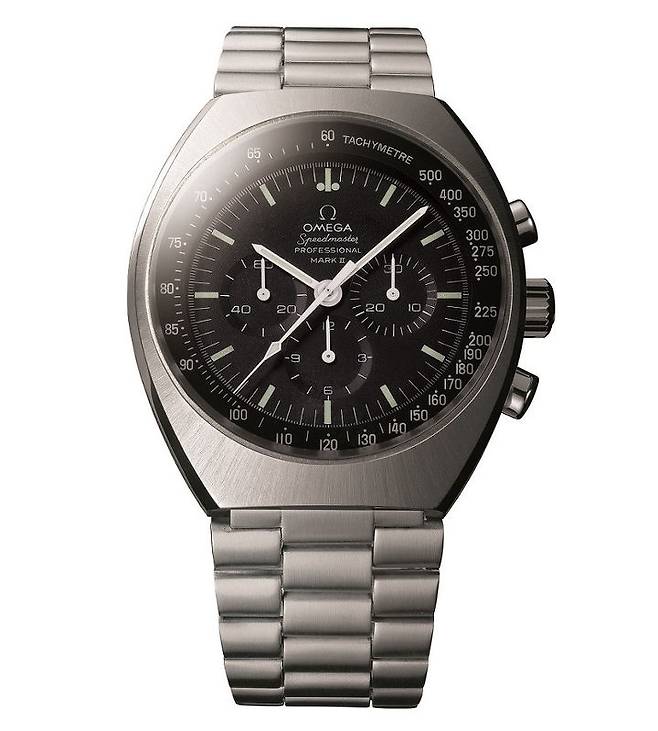 - 1969년 완전히 새로운 배럴형 케이스 디자인으로 선보인 스피드마스터 마크 2(Mark II). 스틸 외, 18K 골드, 골드 캡 버전으로 나뉘어 출시되었으며, 스피드마스터 라인 최초로 헤잘라이트 크리스탈(Hesalite crystal)을 사용하지 않은 모델이기도 함.