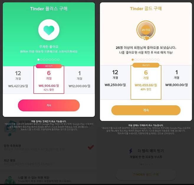 일반적인 구독 서비스의 경우 구독을 진행해야만 서비스를 이용할 수 있는 반면, 틴더에서의 구독은 더 즐겁게 이용하기 위해서는 구독을 한다. 물론 틴더라는 서비스는 이용자 수가 많아야 매칭도 잘 이루어지고, 그로 인해 유저들의 만족도도 증가하는 서비스이기 때문에 틴더의 서비스는 어떻게 보면 당연하다. 현재 많은 데이팅 앱들은 유료 재화나 아이템을 구매하고, 이렇게 구매한 아이템을 사용함으로써 매칭이 이루어지게 된다.