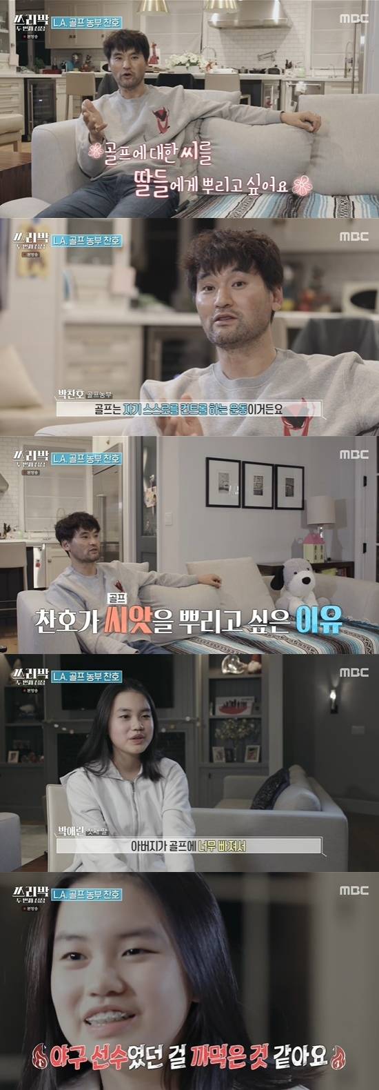 이날 박찬호는 막내 딸 혜린과 마당에서 골프 연습을 하기 위해 나섰다. 박찬호는 "딸들 모두 골프를 하냐"는 질문에 "골프에 대한 씨를 딸들에게 뿌리고 싶다. 골프는 자기 스스로를 컨트롤하는 스포츠다. 그런 면에서 좋다고 생각해서 권한다"라고 밝혔다.