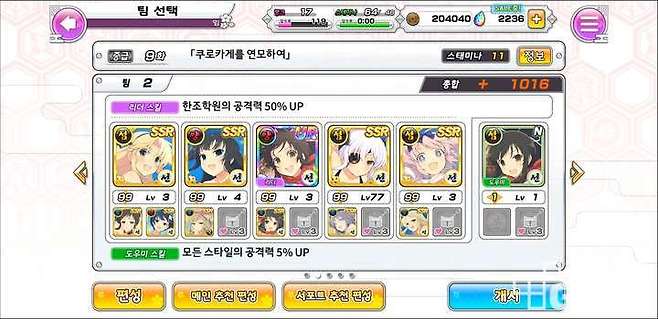 당연하지만(?) 게임은 ‘자동 전투’ 또한 지원합니다. 화면 왼쪽 하단에 있는 (AT) 버튼을 누르면 기본적인 전투는 모두 자동으로 진행되기 때문에 캐릭터 파밍이나 단순 반복 작업에서는 굳이 귀찮게 수동으로 조작하지 않아도 편하게 ‘스태미너’(행동력)을 소비할 수 있습니다.