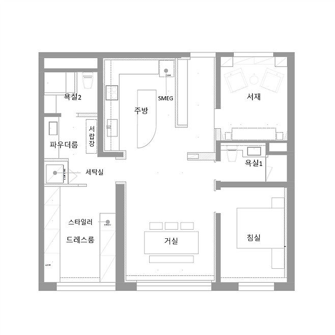 이제 드레스룸 공간을 나오면 맞은편에는 왼쪽부터 서재 ㅣ 가벽 ㅣ 욕실 ㅣ 침실이 위치해있습니다.