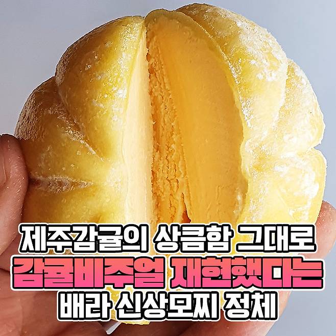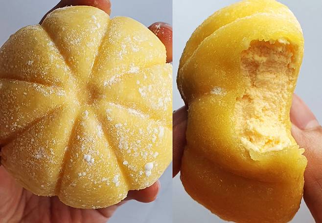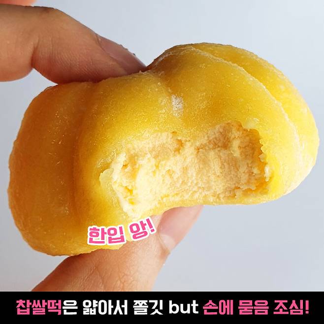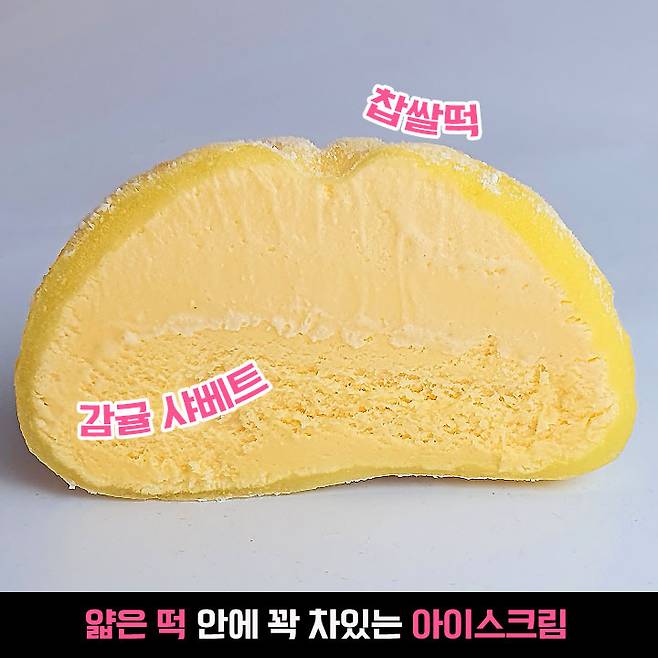 아이스크림 질감처럼 부드러워 보이는 감귤 샤베트 를 얇은 찹쌀떡이 감싸고 있는 비주얼이에요.