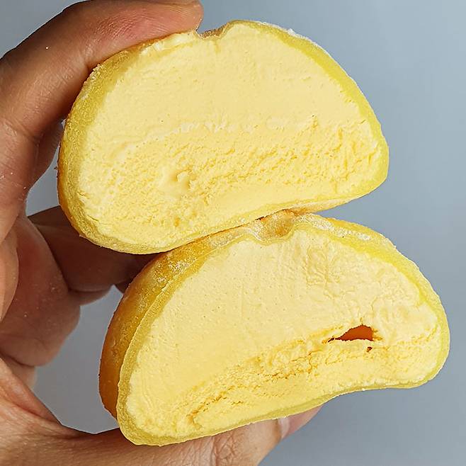 냉동실에서 갓 꺼낸 제품이라 아직 꽝꽝 얼어있네요. 10분 정도는 실온에 둬야 먹을만한 정도로 녹는듯해요. 갓 꺼낸 모찌 깨물어 먹으려다 이빨 나갈뻔한 밥심<(_ _)> 얼어있을 때 깔끔하게 단면 잘라봤어요.