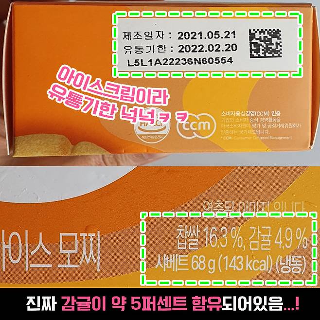 냉동제품이라 유통기한은 넉넉하네요. 이건 감귤 이 거의 5퍼센트나 들어있네요...! 항상 'OO 향 시럽' 극소량 함유된 성분표만 보다가 이 정도 함량을 보니 넉넉하게 느껴지는... (크흑)