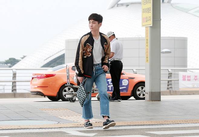 이날 키는 귀여운 헤어스타일에 편안하면서도 유니크한 스카쟌과 크롭진을 매치, 멋스러운 공항패션을 선보였다.