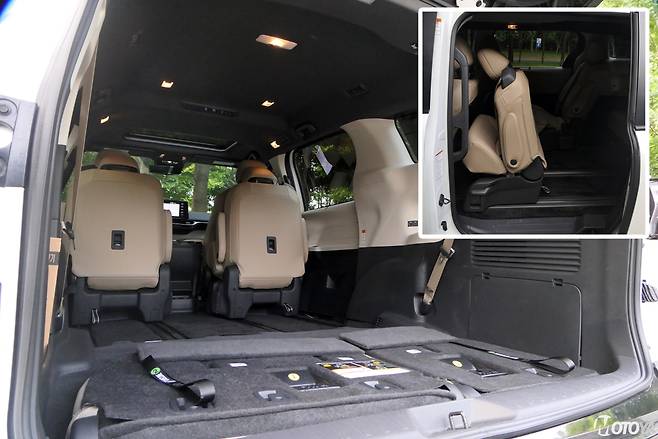 그리고 싱킹시트 구조로 만들어진 3열 좌석을 바닥에 접어 넣으면 어지간한 SUV는 물론, 국산 9인승 미니밴에서는 구현할 수 없는 어마어마한 공간이 창출된다. 이래도 공간이 부족하다고 느낀다면, 2열좌석을 앞쪽으로 접어주면 된다. 2열 좌석은 맨손으로 탈거는 불가능하지만 착좌부가 팁업되는 구조로 설계되어, 완전히 접었을 경우에도 공간을 크게 차지하지 않도록 배려했다.