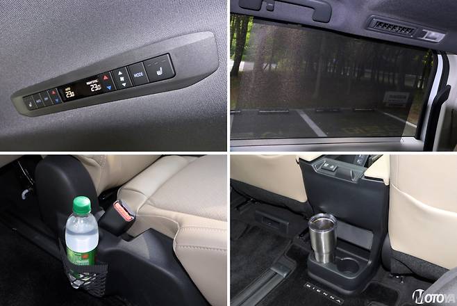 승합차의 혜택을 받기 위해 억지로 4열까지 우겨 넣는 바람에 2/3열 공간에서 패널티를 안을 수 밖에 없는 9인승 국산 미니밴은 꿈도 못 꿀 수준의 내부 공간을 자랑한다. 2열 좌석은 전용의 공조장치 패널, 선셰이드와 더불어 플로어콘솔 상단에 USB 포트를, 그리고 하단 부분에 2개의 큼직한 컵홀더를 제공한다. 아울러 도어포켓 뿐만 아니라 시트 측면에도 추가로 그물형의 보틀 홀더를 제공한다.