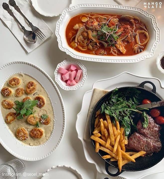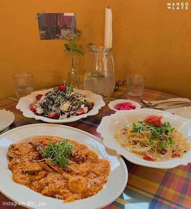 순천의 '옥리단길'로 유명한 옥천동! 한옥을 개조해 만든 팡파르는 유럽 가정식을 즐길 수 있는 레스토랑으로 순천의 핫플레이스인데요. 지금같이 햇살이 좋을 때는 마당에서 식사를 즐기는 것도 좋습니다. 뜨거운 철판 위에서 구워먹는 살치살 스테이크부터 버섯크림뇨끼, 다양한 종류의 파스타까지. 가격도 저렴한 편이어서 부담 없이 즐길 수 있습니다. 특히 사이드 메뉴인 토마토 라면은 한 번 맛보면 계속 생각나는 중독성 있는 맛을 자랑합니다.