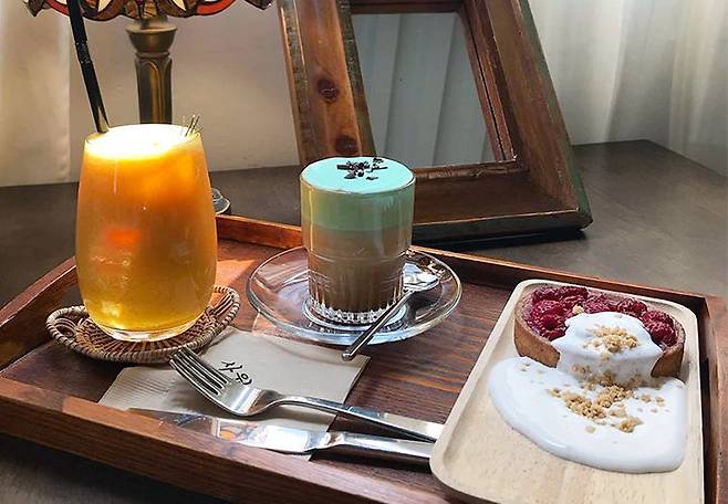 조례호수공원에 제주도 감성을 제대로 느낄 수 있는 포토존이 있는 카페입니다. 창 너머로 보이는 귤나무까지 완벽하게 제주도 느낌이 가득해요! 5인 이상의 단체만 이곳에 앉을 수 있고 평소에는 포토존으로 많이 찾는 곳이에요! 인생샷을 남겼으면 커피와 디저트도 즐겨봐야죠! 타르트, 브라우니 등의 디저트에 커피와 주문하면 기본으로 비스킷까지 주신답니다.