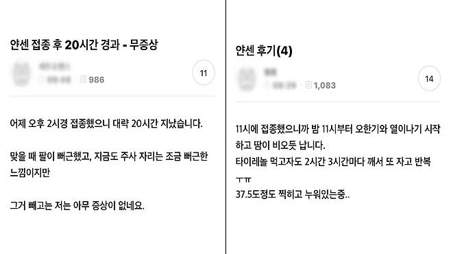 같은 백신을 접종 받은 다른 사람들은 어떤지 궁금해 인터넷 커뮤니티 등을 가봤더니 역시나 얀센 접종 후기들이 많이 올라와 있었습니다.
