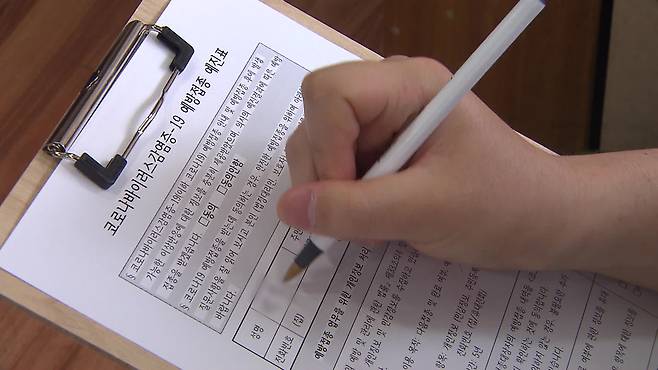 먼저 체온을 측정하고, 이어 접종 예약자 확인을 거쳤습니다. 예진표를 작성했습니다. 최근에 수술한 적은 있는지, 다른 접종은 한 적이 있는지, 평소와 달리 몸 상태에 이상이 있는지, 복용하는 약이 있는지 등 성심성의껏 작성해 제출했습니다.