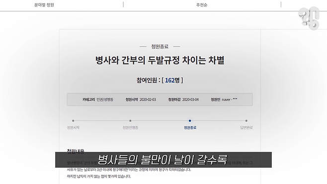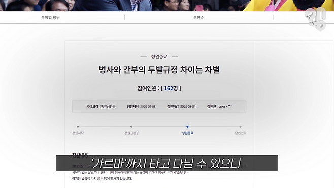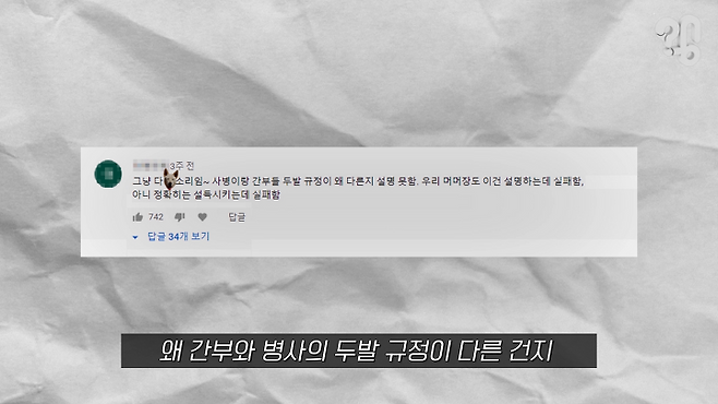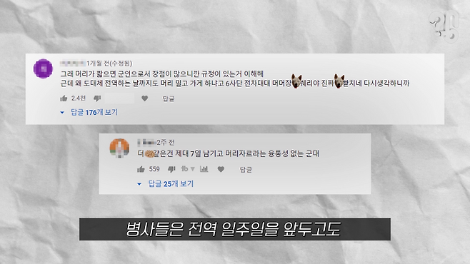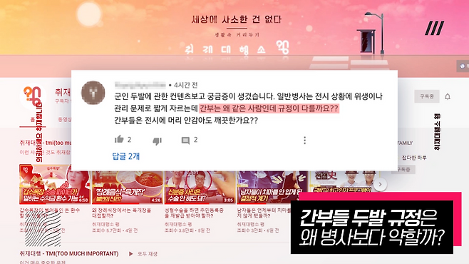 유튜브 댓글로 “일반 병사는 전시 상황 시 위생 문제로 머리를 짧게 자르는데, 간부는 왜 규정이 다른지 알아봐 달라”는 의뢰가 들어와 취재해봤다.