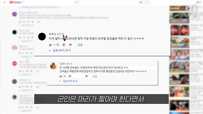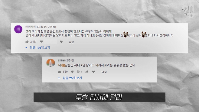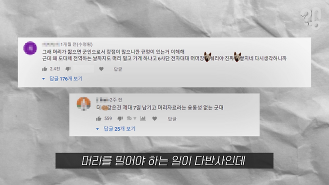 유튜브 댓글로 “일반 병사는 전시 상황 시 위생 문제로 머리를 짧게 자르는데, 간부는 왜 규정이 다른지 알아봐 달라”는 의뢰가 들어와 취재해봤다.