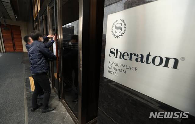 [서울=뉴시스]이윤청 기자 = 신종 코로나바이러스 감염증(코로나19) 장기화로 호텔 등 숙박업 경영난이 지속하고 있는 1일 서울 서초구 쉐라톤 서울 팔래스 강남호텔에서 관계자들이 영업종료 안내문을 붙이고 있다. 2021.02.01. radiohead@newsis.com