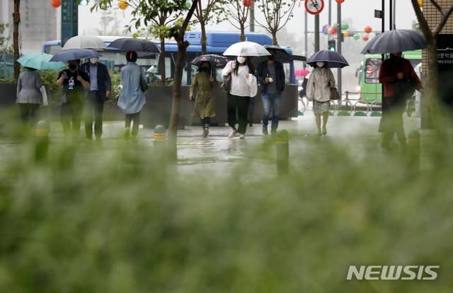 [서울=뉴시스]고승민 기자 = 전국이 대체로 흐리고 수도권과 춘천, 광주 지역에 비가 내린 27일 서울 청계천 인근 도로에서 우산을 쓴 직장인들이 출근하고 있다. 2021.05.27. kkssmm99@newsis.com