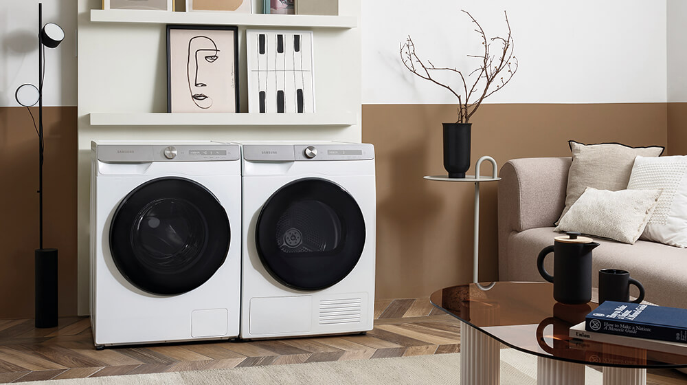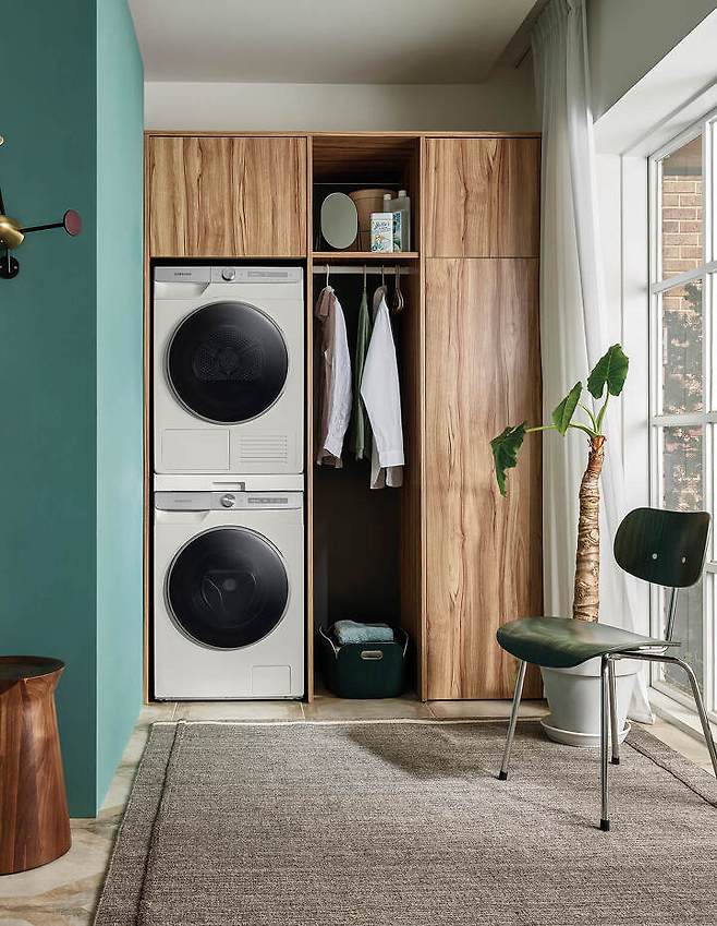 큰 창으로 햇살이 쏟아져 들어오는 테라스와 리빙 룸 사이. 자칫 낭비될 수 있는 자투리 공간이지만, 좋아하는 옷을 자주 세탁하고 케어하는 특별한 스페이스로 바꿔보는 것도 좋은 방법이다. 컴팩트한 사이즈의 그랑데 AI 소용량 제품을 핏하게 빌트인하면, 깔끔한 동시에 답답해 보이지 않는 인테리어를 완성할 수 있다. 컴팩트한 사이즈 덕분에 직렬로 설치해도 성인 여성이 상단의 건조기까지 쉽게 작동할 수 있다.