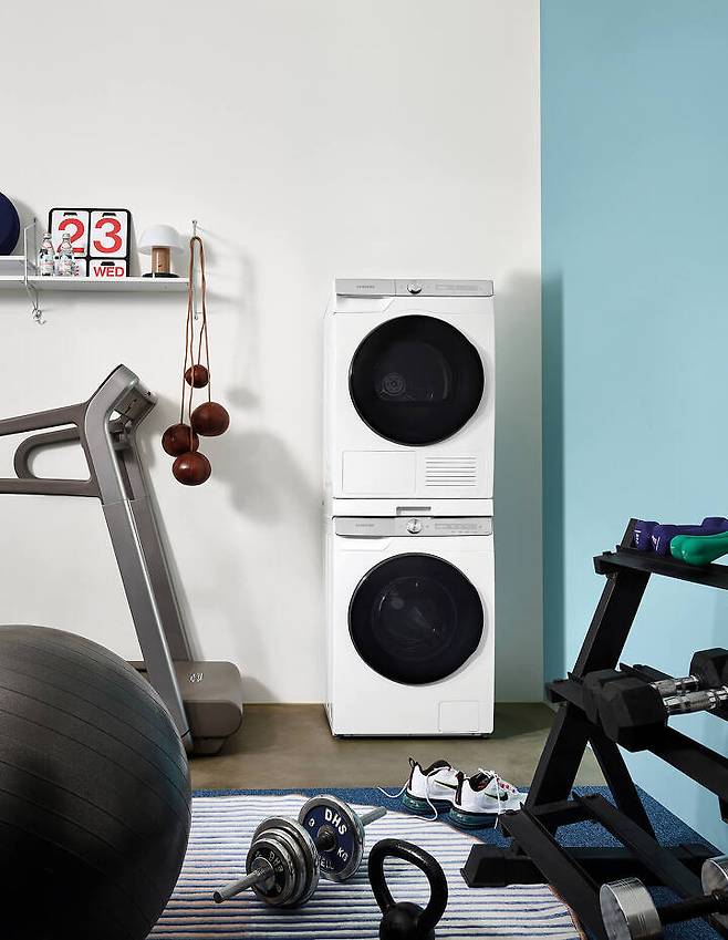 운동 마니아라면 누구나 나만의 피트니스센터, 홈짐을 꿈꿀 터. 유산소운동 기구와 근력운동 기구를 다양하게 갖춘 나만의 완벽한 운동 공간에 자연스럽게 자리한 세탁기와 건조기는 그랑데 AI 소용량 화이트 컬러다. 운동기구가 여럿 놓인 작은 공간이지만, 컴팩트한 크기와 직렬 설치로 공간 활용도를 높였다. 세탁물 무게와 오염도를 감지해 세제량과 세탁 시간을 알아서 조절하는 AI 맞춤세탁과 센서로 정확하고 빠르게 건조 가능한 AI 쾌속건조로 운동복과 수건을 매일 보송하게 관리할 수 있다.
