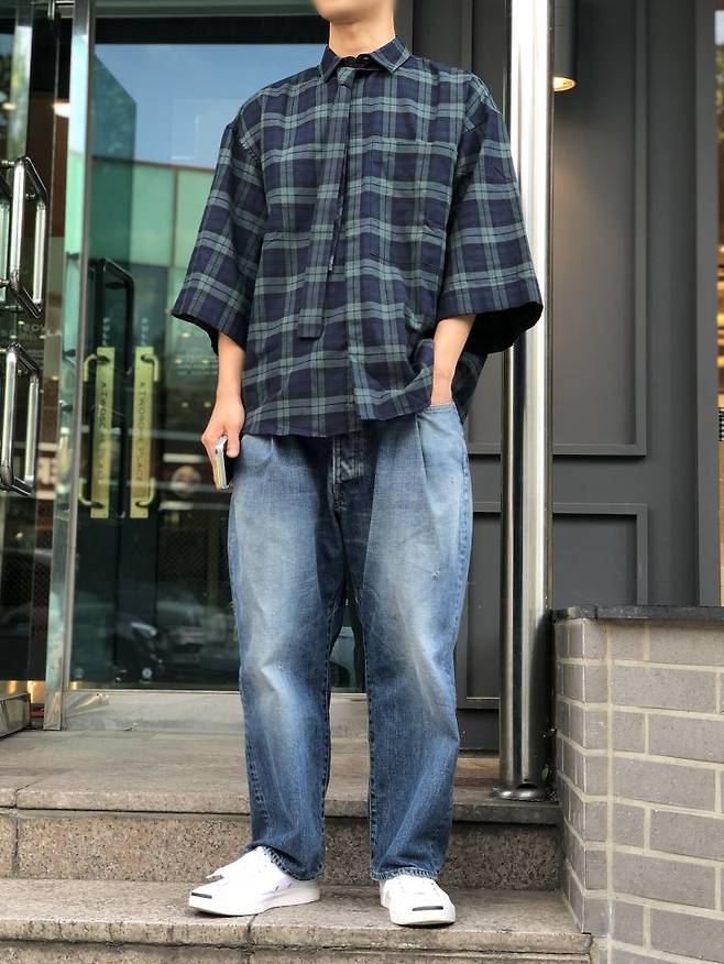 셔츠랑 청바지, 스니커즈와 함께 입어봤어~