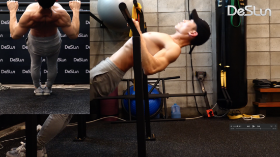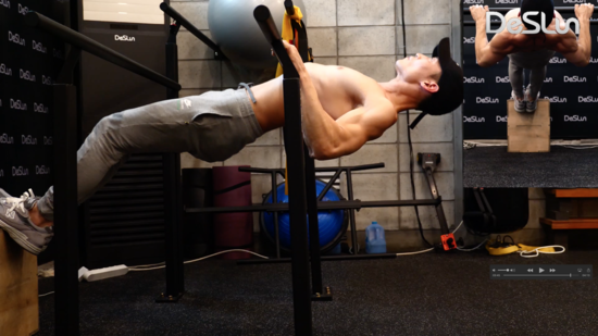 인버티드 로우라는 동작입니다. 발을 바닥에 놓고 하는게 수월해지면 상자에 다리를 올리고 해보세요.