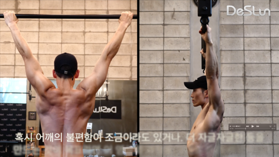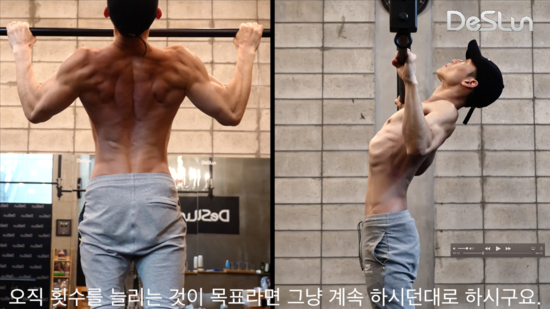 오른쪽은 등이 말리며 어깨에 자극이 좀 더 가는 턱걸이 입니다.