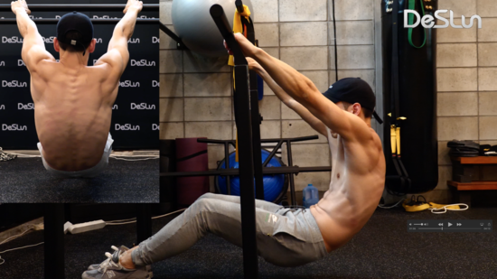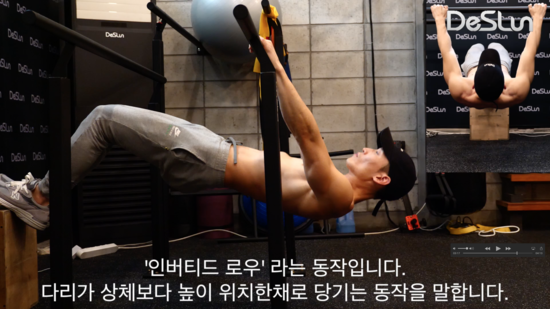 인버티드 로우라는 동작입니다. 발을 바닥에 놓고 하는게 수월해지면 상자에 다리를 올리고 해보세요.