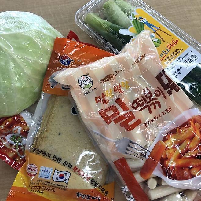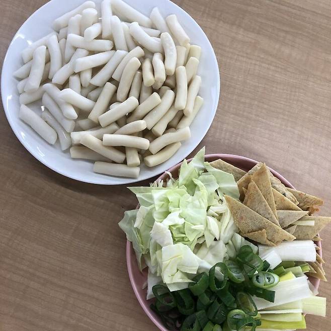 (급전개) 재료는 쌀떡 400g, 밀떡 400g, 어묵 160g, 양배추 2컵, 대파 2컵, 삶은 달걀
