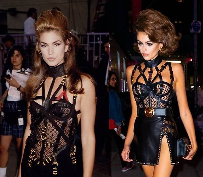 ↑사진 = 지난해 9월 카이아 거버가 18번째 생일룩으로 27년전인 1992년 신디 크로포드가 입었던 스타일을 재현한 모습.