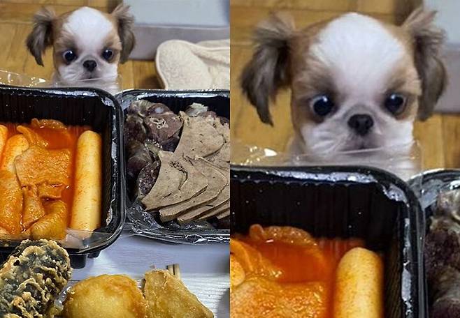 "제가 순대 간을 좋아해서 배달시켰는데, 저희 구찌도 간만 보면 환장을 해서 저랑 대치중에 찍은 사진"이라고 설명한 구찌의 보호자.