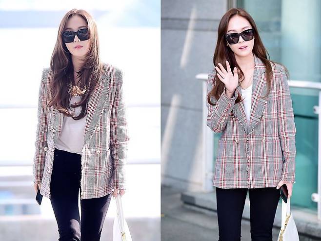 이날 체크 패턴의 재킷과 늘씬한 기럭지가 돋보이는 블랙 스키니 팬츠, 화이트 티셔츠로 깔끔한 시크룩을 완성했다. 이와 함께 와인 컬러의 레더 앵클부츠로 포인트를 주어 더욱 스타일리시한 공항패션을 완성했다.