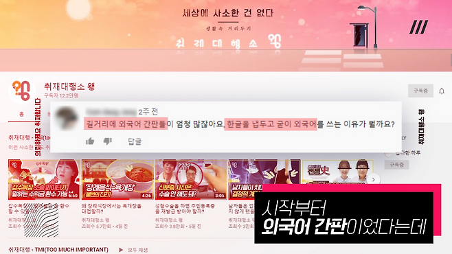 유튜브 댓글로 ‘우리나라 거리에 즐비 한 외국어·외래어 간판이 보기 안 좋다. 왜 저런 간판이 많아 진건지 알아봐 달라’는 취재가 들어왔기 때문이다.