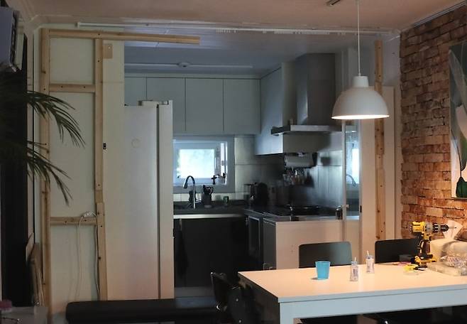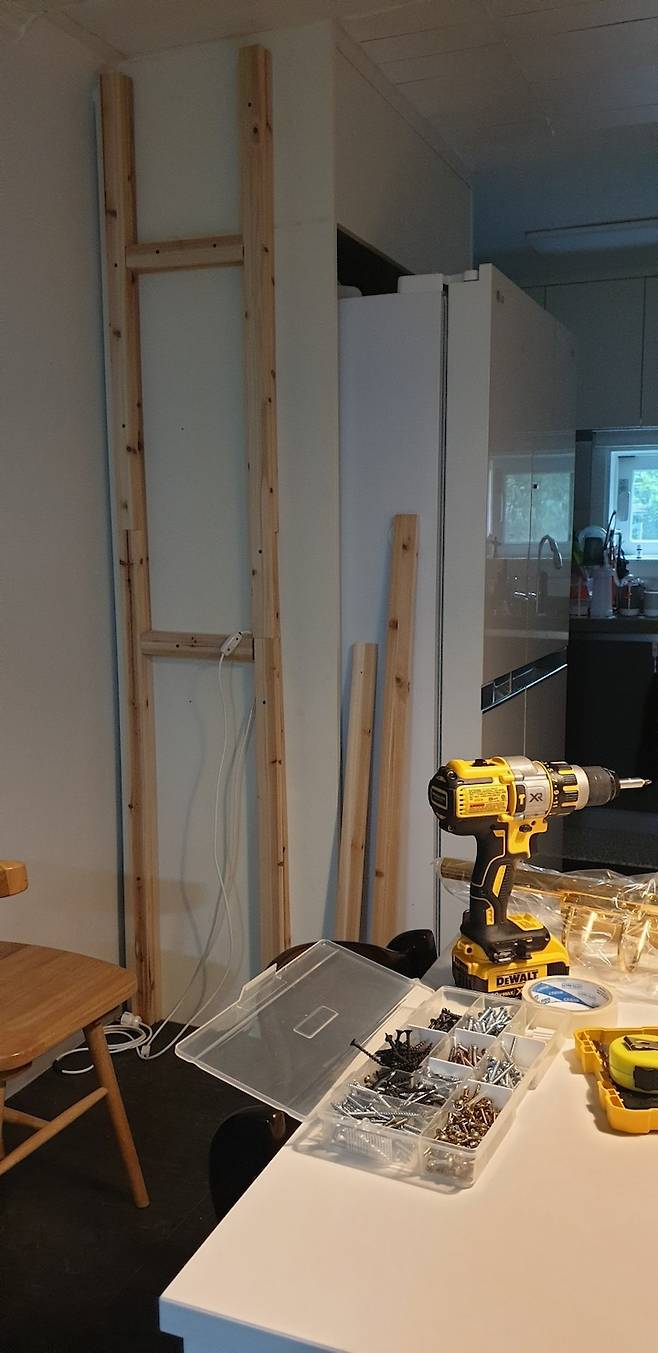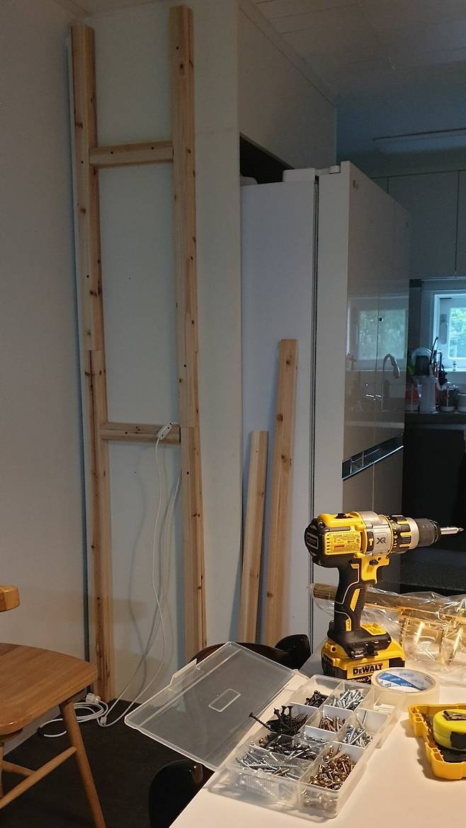 그리고 좌측은 냉장고장, 우측을 이동한 청소기 수납장에 목재를 주문하여 어느 정도 가벽의 틀을 만들어 주었어요.