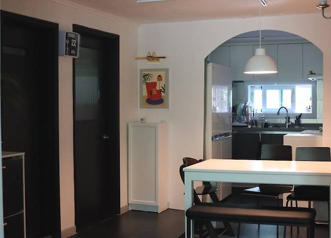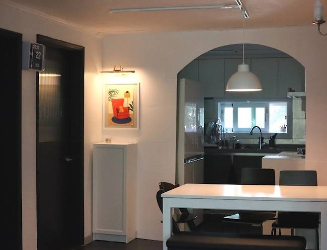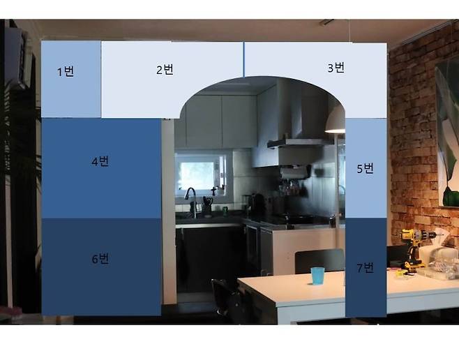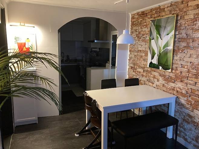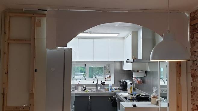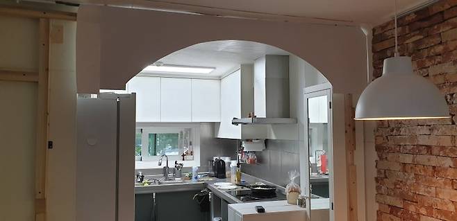 가벽이 뿅! 주방과 식사 공간을 아치 형태의 가벽으로 구분하였어요.