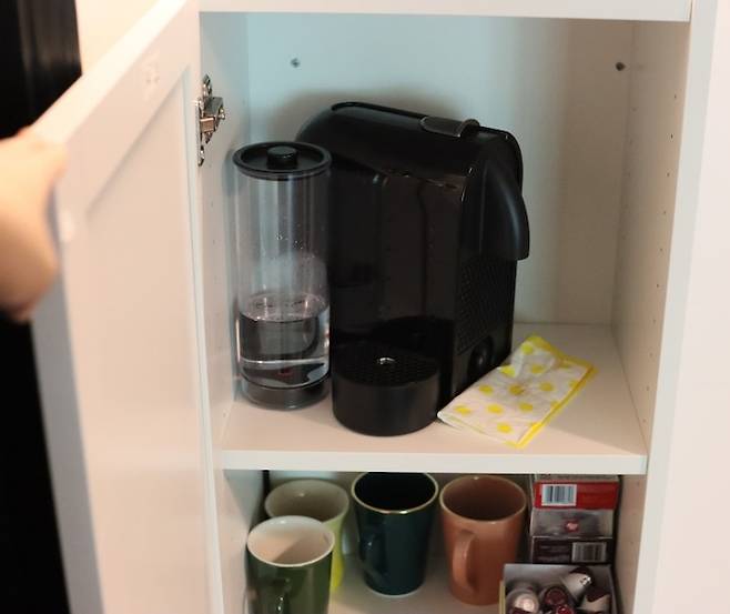 그리고 그 아래에는 작은 수납장을 놓아서 안쪽으로 엄선된 커피잔과 커피머신을 놓았답니다.
