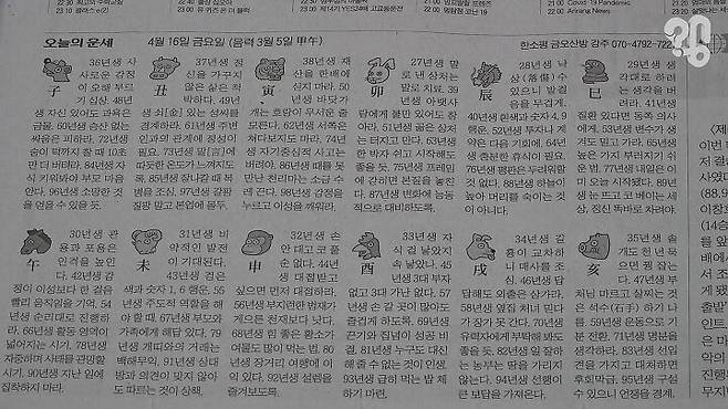 10대 종합지와 주요 경제지 등을 다 살펴봤는데 지면에 띠별 운세를 제공하는 신문사는 조선 중앙 동아 서울 한국 세계 매경 등 7곳이었고