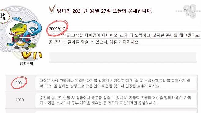 2곳은 2001년생까지 띠별 운세를 제공했고,