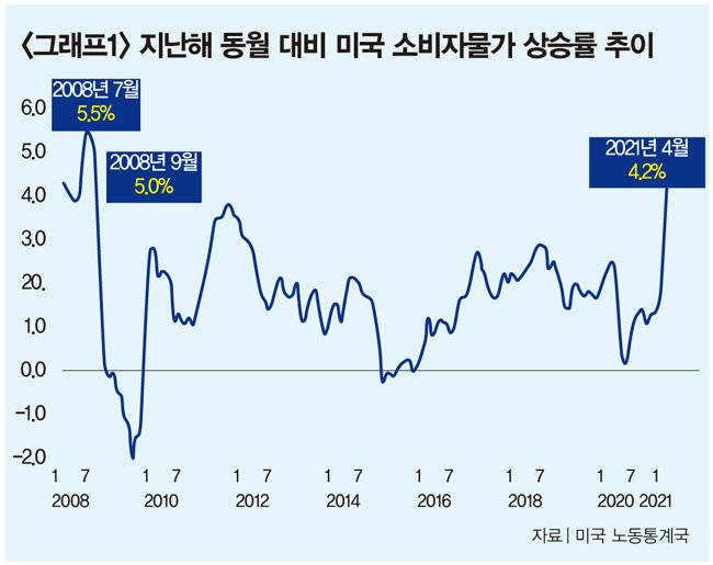 미국의 4월 소비자물가가 지난해 동월 대비 4.2% 올라 2008년 9월 5% 상승 이후 13년 만에 최대치를 보였다(그래프1 참조). 시장 경기가 정상 수준을 회복하면서 인플레이션 가능성이 높아진 상황이다. 최근 인플레이션 우려로 지난해 말 0.193%였던 미국 10년물 국채 금리가 1.6%대를 웃도는 등 상승하고 있다(그래프2 참조). 인플레이션을 잡기 위해 금리인상 시기를 앞당길 확률이 커졌다. 도이체방크는 보고서에서 "연준의 판단과 달리 인플레이션은 지속적일 것"이라며 "연준이 2023년에야 금리인상에 나서는 것은 너무 늦다"고 주장했다.