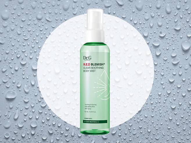 피부 진정 효과가 뛰어난 5가지 시카 성분과 스피어민트 추출물이 태양빛으로 열 오른 보디 피부의 온도를 낮춘다. 뜨거워진 피부를 그대로 방치할 경우 모공 주변의 각질 과 피지가 쌓이고 톤까지 얼룩덜룩 해지는 것이 문제. 각질 제거에 효과적인 AHA, BHA, PHA 콤플렉스가 모공 주변의 각질을 정돈함과 동시에 과도한 피지가 분비되는 것을 막는다. 안개처럼 가볍고 고운 입자가 피부에 닿는 순간 산뜻하게 흡수되어 끈적임 또한 남지 않는다. 닥터지 레드 블레미쉬 클리어 수딩 바디 미스트 155ml 1만9000원.