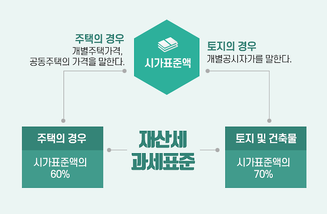 여기서 또 하나 점검할 점은, 재산세 과세표준이다. 토지 및 건축물은 시가표준액의 70%, 주택의 경우 시가표준액의 60%를 재산세 과세표준으로 하고 있다. ‘시가표준액’이란 주택의 경우 개별주택가격, 공동주택가격을 말하고 토지의 경우에는 개별공시지가를 말한다.
