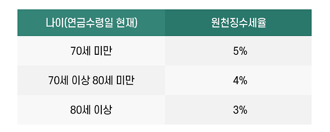 다만, 퇴직연금과 연금저축에 대해 사망할 때까지 연금을 수령하는 종신계약(사망일까지 연금을 수령하면서 중도해지를 할 수 없는 계약)에 따라 받는 연금소득은 3 ~ 5%가 적용된다.