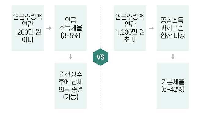 연금소득 과세대상 수령액이 연간 1,200만 원 이내인 경우 연금소득세율(3~5%)에 의해 원천징수 후에 납세 의무를 종결할 수도 있다. 반면 연간 1,200만 원을 초과하는 경우 종합소득 과세표준 합산 대상에 해당, 원천징수세율보다 높은 기본세율(6~42%)에 의해 과세한다.