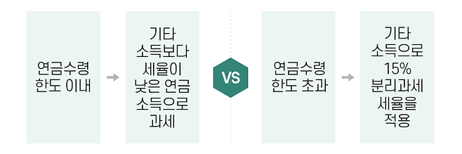 연금 형태로 받으면서 연금수령 한도를 초과하는 경우 기타 소득으로 15% 분리과세 세율을 적용해야 한다. 그러나 연금수령 한도 내 금액은 기타 소득보다 세율이 낮은 연금소득으로 과세할 수 있기 때문이다.
