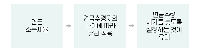 연금저축을 연금 형태로 받더라도 연금소득세율은 연금수령자의 나이에 따라 달리 적용된다. 즉, 수입 금액을 고려하면서 세금 혜택을 최대한 누리기 위해서는 수령 시기를 조절하는 것이 바람직하다.