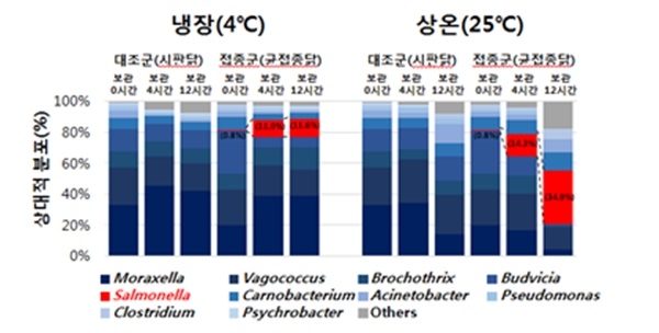 식품의약품안전처는 닭고기로 인한 살모넬라 식중독을 예방하기 위해 살모넬라균을 접종한 생닭을 냉장온도(4℃)와 상온(25℃)에서 각각 4시간, 12시간 보관한 결과, 상온 보관에서 살모넬라균 분포와 균수가 모두 증가하는 것을 확인했어요.