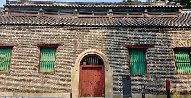 | ▲ 번사창 정면 세부 장대석과 사괴석으로 기단을 만들고 그 위에 짙은 회색조 벽돌을 2중으로 쌓았다. 정문은 아치형 화강암이고 창문은 모양이 다르다. 서까래 없이 잘려나간 지붕처마와 한옥기와를 얹은 지붕은 목재트러스를 짜 지지시켰다. 열과 먼지등을 배출할 목적으로 들어올린 고측창이 보인다. |