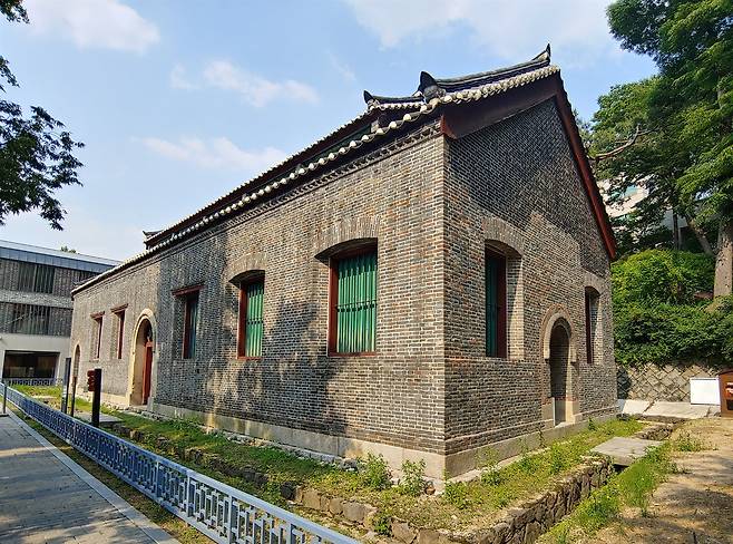 | ▲ 번사창 정면 모습 화강암으로 만든 정문과 벽돌로 만든 측문이 보인다. 모양이 다른 5개 창과 서까래 없이 벽에서 잘려나간 지붕 처마가 이색적이다. 지붕에 한층을 들어올린 고측장이 보이고, 건물은 짙은 회색조의 중국식 벽돌을 사용하였다. |