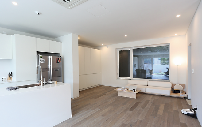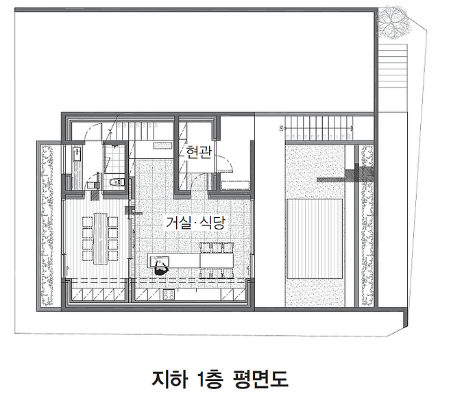지하 1층은 거실과 주방, 욕실의 단출한 구조이고, 힐링 포인트로 전면 마당에 메인 가든과 비어 가든을 조성했다. 산딸나무, 라일락, 각종 그라스와 아름다운 식물이 가득한 메인 가든은 조경 전문 업체인 팀펄리가든에 정원 디자인을 맡겼다. 내부는 크게 관리하지 않아도 정갈한 공간을 유지시켜줄 수 있도록 거실과 주방을 이어 하얀 붙박이장을 크고 길게 설치했다. 모든 생활 집기를 수납할 수 있다 보니 내부는 비워진 공간으로 마치 홈그라운드 같은 느낌이 든다.