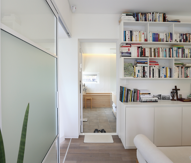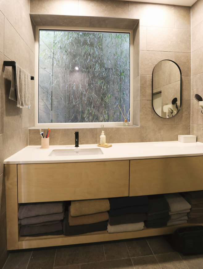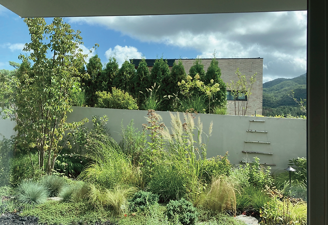실내에서 조망이 가장 좋은 곳은 지상 1층 욕실이다. 욕실 편백나무 욕조에 누우면 선셋가든 너머로 광교산 풍경이 고스란히 들어와 힐링 사우나와 함께 전원의 여유를 만끽할 수 있다.