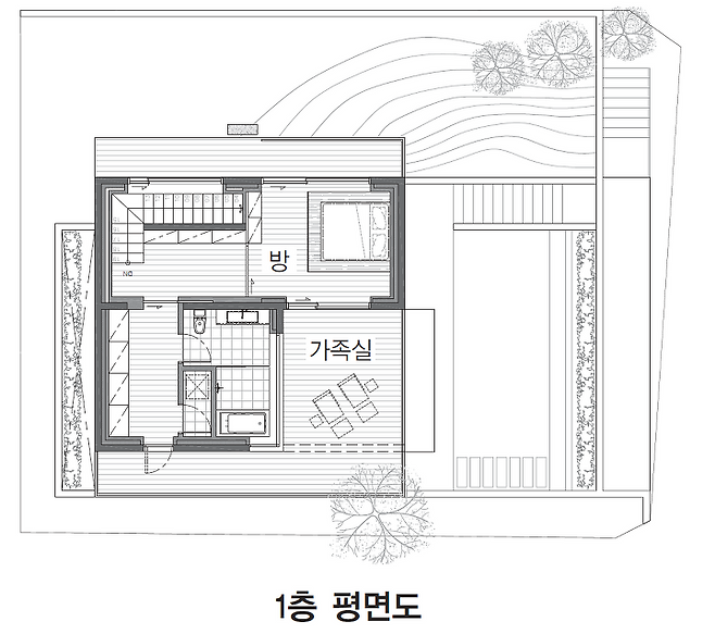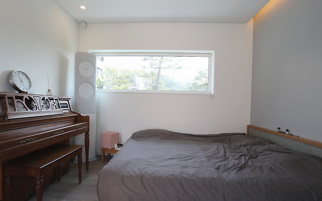 1층은 부부 침실과 드레스룸, 욕실, 서재 겸 가족실로 구성하고, 야외 테라스인 선셋가든과 작은 티가든을 만들었다. 부부 침실과 이어진 선셋가든에서는 바라산과 광교산이 시원하게 들어와 자연의 여유를 즐기기에 안성맞춤이다. 티가든은 비워둔 공간으로 부부가 살면서 하나씩 심고 일구며 만들어가고 있는 중이다.
